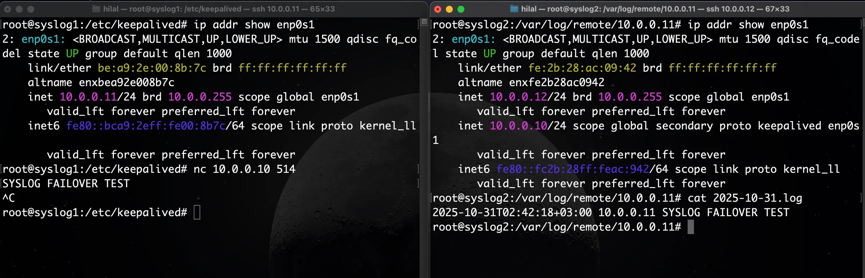 The VIP (10.0.0.10) automatically returns to syslog1, and log forwarding continues without interruption β confirming that both failover and recovery function as expected.