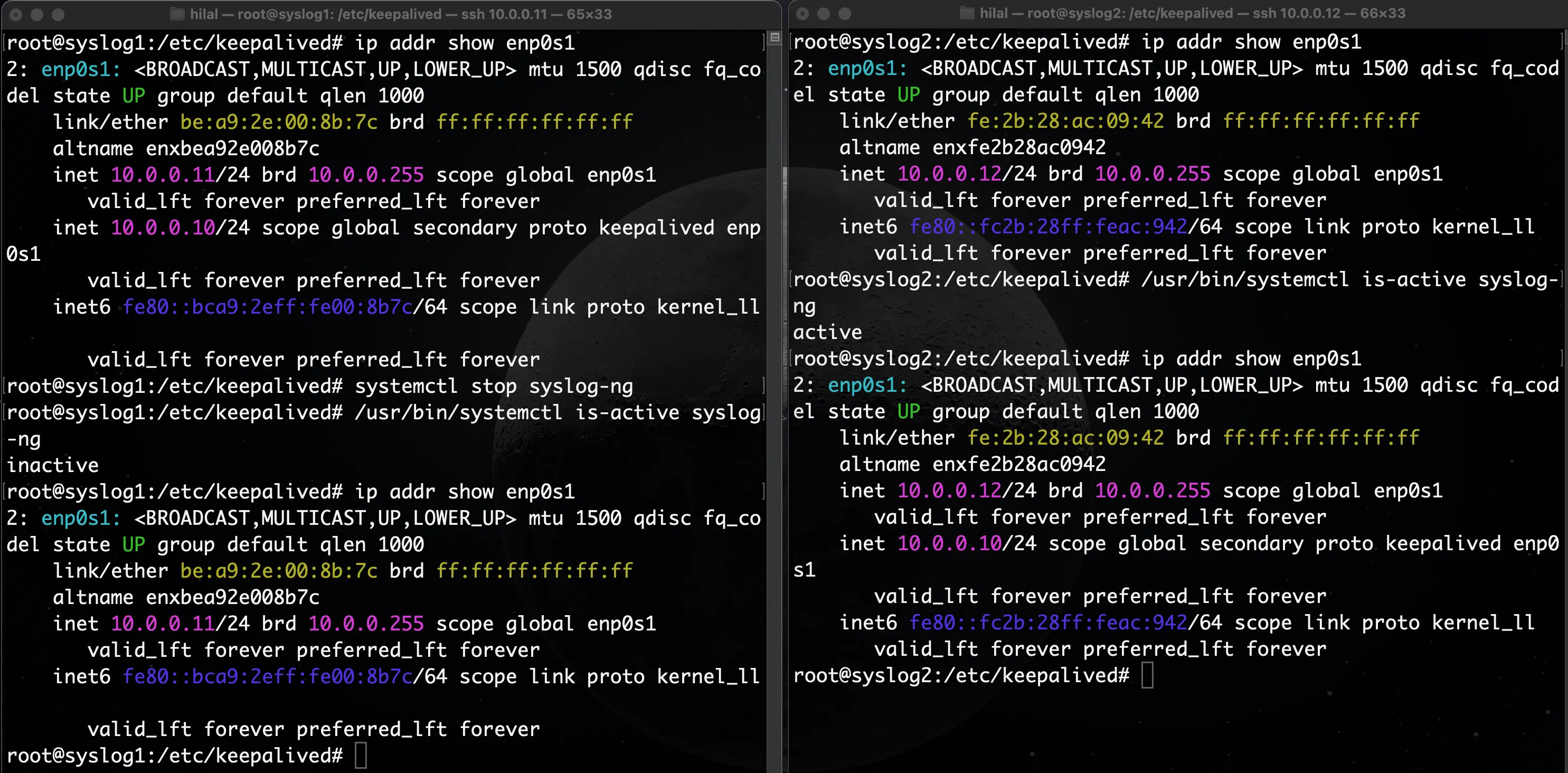 As a result, the BACKUP node (syslog2) will automatically take over the Virtual IP (VIP).
